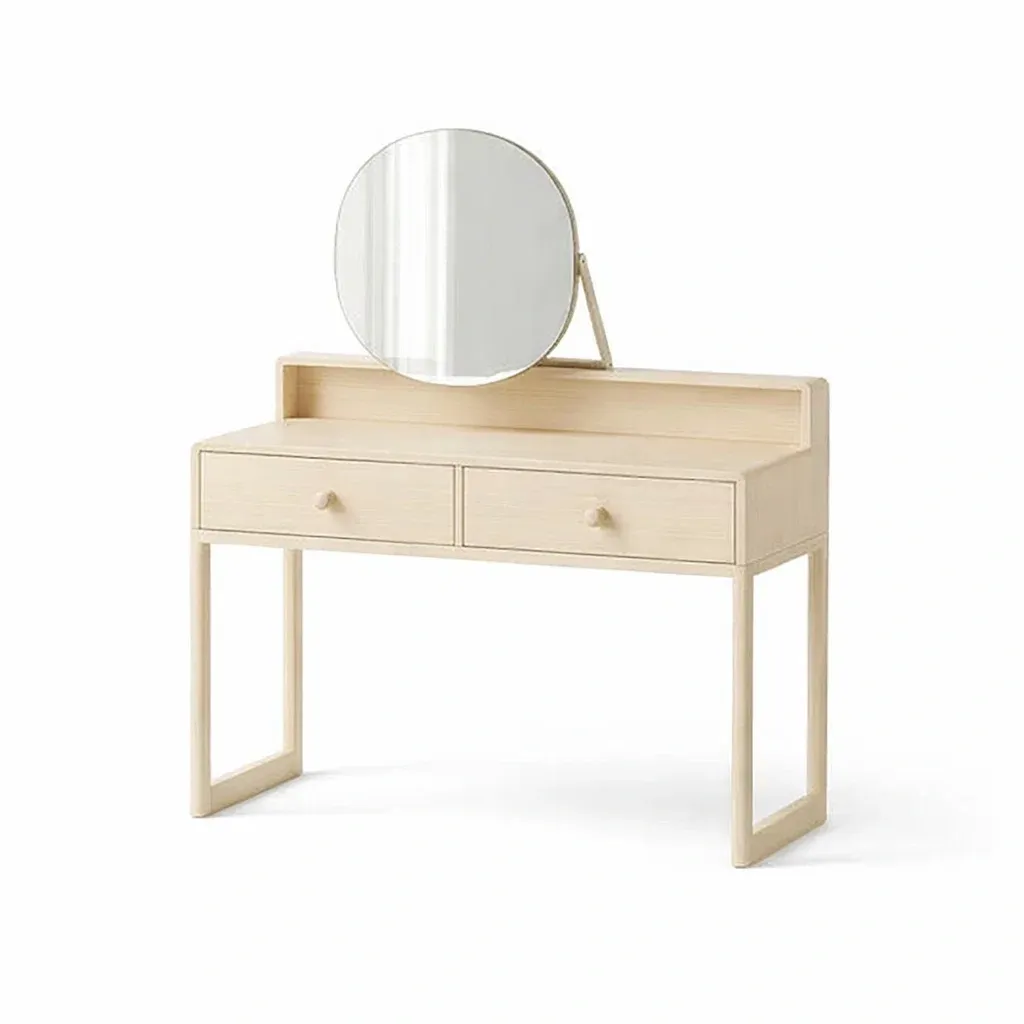 Coiffeuse en bois avec miroir rond et deux tiroirs blancs