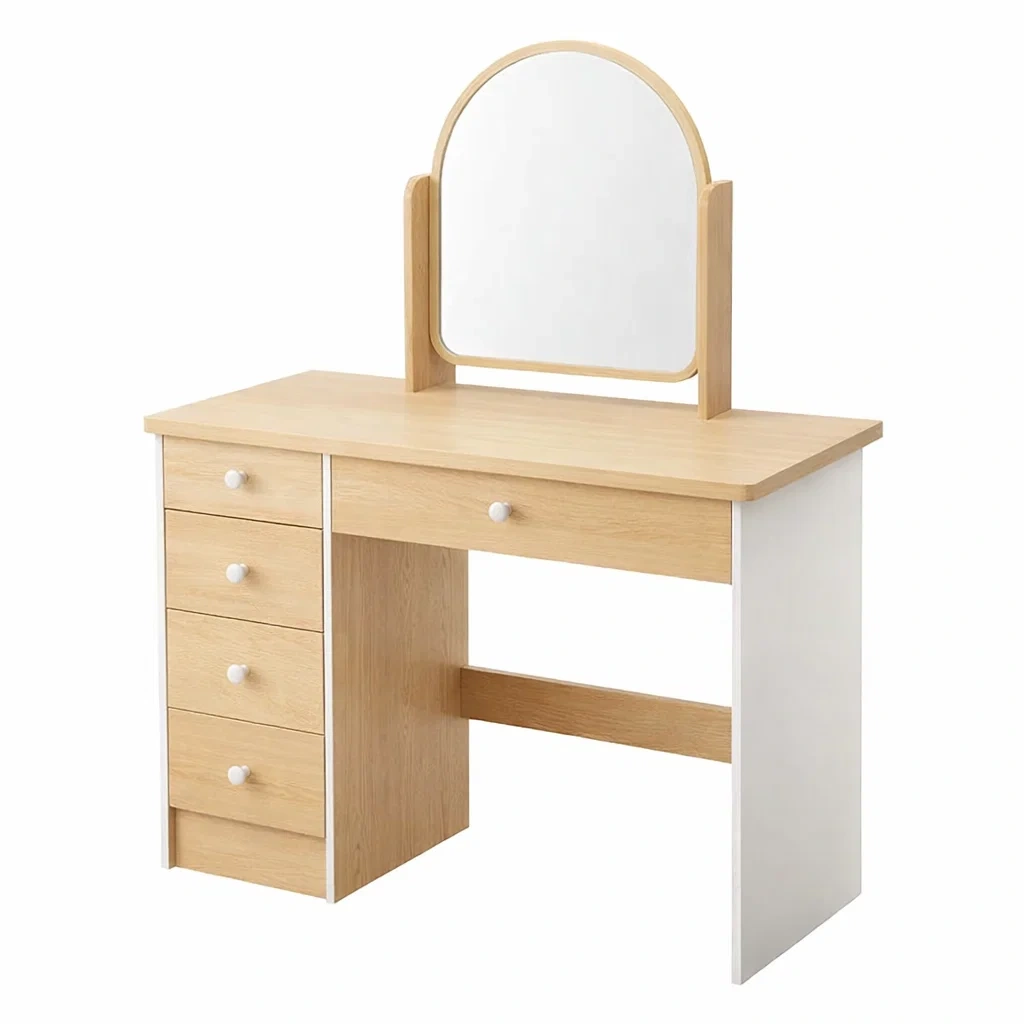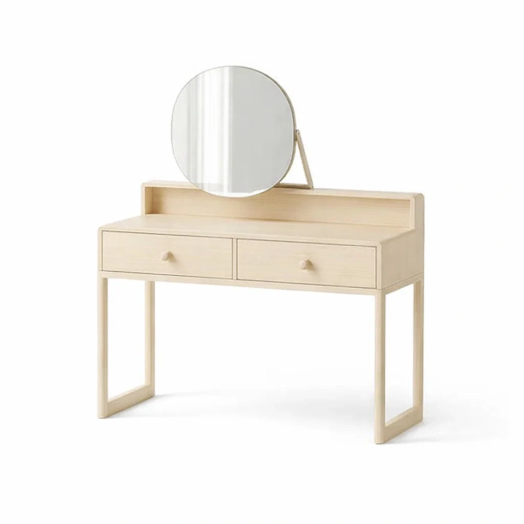 Coiffeuse en bois clair avec miroir rond et tiroirs