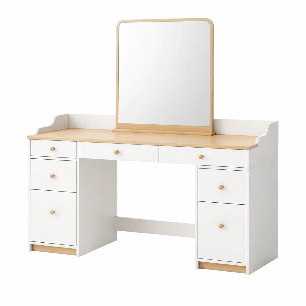 Coiffeuse en bois miroir 7 tiroirs blanc et naturel
